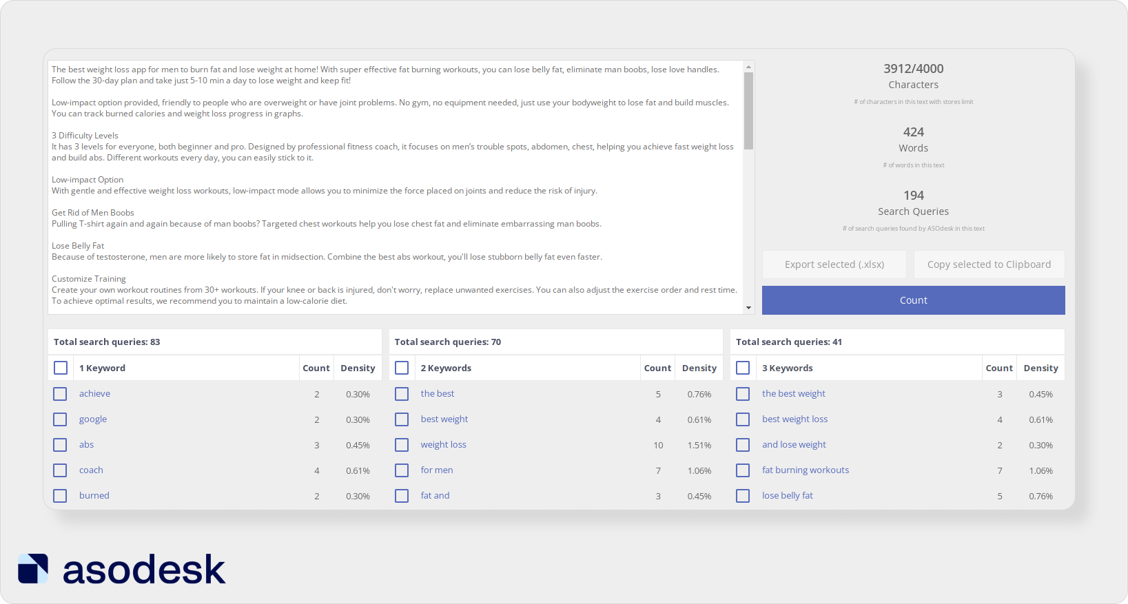 Бесплатный инструмент Keyword Density Counter в Asodesk покажет количество повторов ключевых слов в описании приложения.
