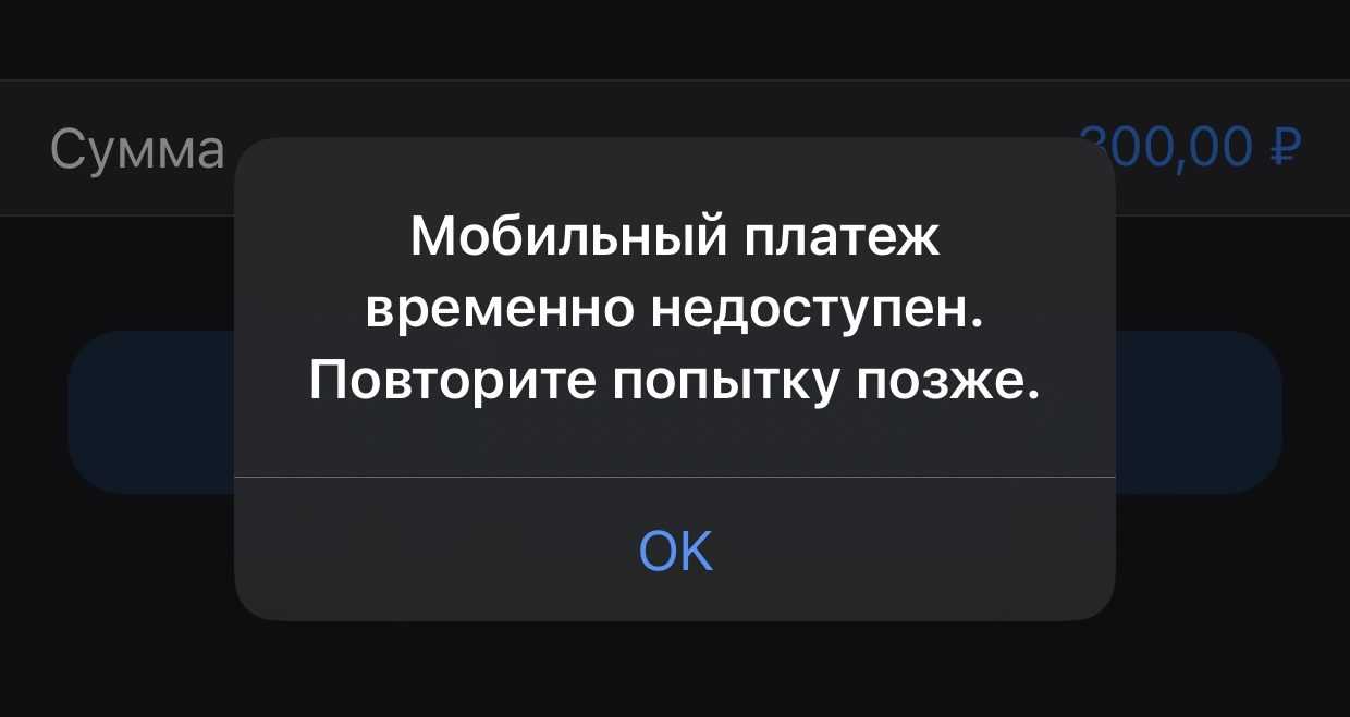 При попытке оплаты или пополнения счёта может отобразиться ошибка «Мобильный платёж временно недоступен. Повторите попытку позже.»