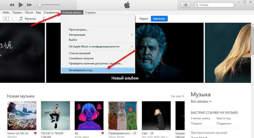 Активируются подарочные сертификаты и на ПК: либо на официальном сайте Apple, либо через iTunes – сразу после авторизации. Кнопка «Активировать код» появится после вызова контекстного меню «Учетная запись» из верхней части интерфейса знаменитого медиаплеера.