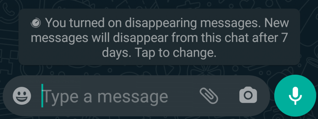 Вернувшись в окно чата, вы увидите новый исчезающий значок сообщения на аватарке этого контакта. Любые сообщения или медиа, которые вы отправляете этому конкретному контакту, автоматически исчезают через 7 дней.