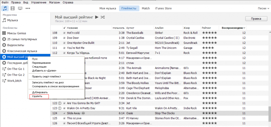 Чтобы удалить трек, также нужно нажать на него правой кнопкой мыши и выбрать соответствующий пункт «Удалить». Песня не удаляется из фонотеки, ее можно удалить только из определенной музыкальной коллекции. Если композиция добавляется в разные плейлисты, ее нужно будет удалить из каждой сборки отдельно.