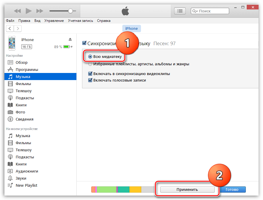 Далее у вас два пути: синхронизировать всю музыку из медиатеки iTunes или же скопировать лишь отдельные плейлисты.