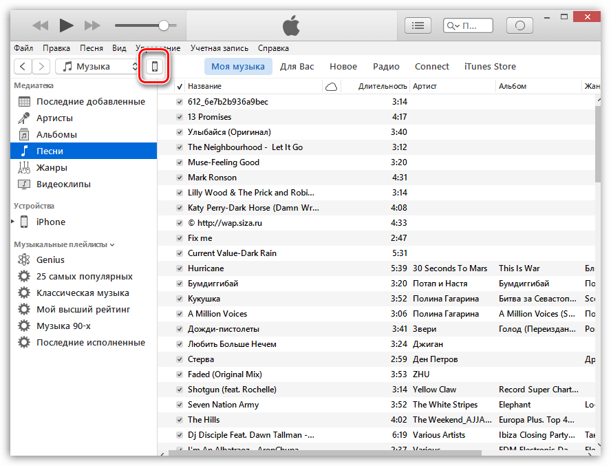 Теперь можно переходить непосредственно к процедуре копирования плейлиста на ваш iPhone. Для этого щелкните в верхней области iTunes по иконке iPhone.