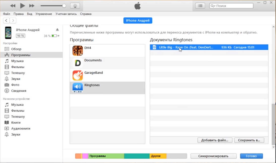 Песня будет добавлена в программу. Теперь через USB подсоедините Айфон, и активируйте синхронизацию. Музыкальная композиция для звонка появится на устройстве.
