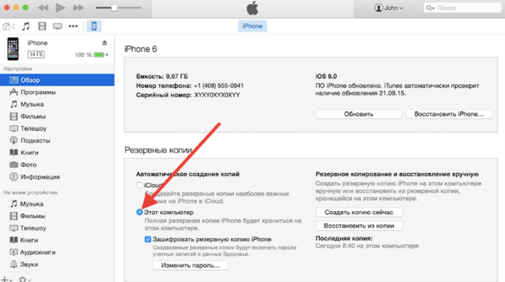 - восстановление через iTunes. Для этого нужно подключить устройство к компьютеру, зайти в программе во вкладку «Обзор» и выбрать опцию «Восстановить iPhone».