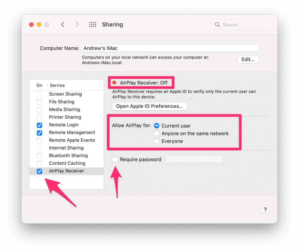Несмотря на то, что AirPlay требует, чтобы вы вводили четырехзначный код, отображаемый на Mac-приемнике AirPlay, все же может быть хорошей идеей установить флажок «Требовать пароль» и ввести пароль. Это добавляет еще один уровень защиты, помогающий предотвратить несанкционированный доступ к вашему Mac.