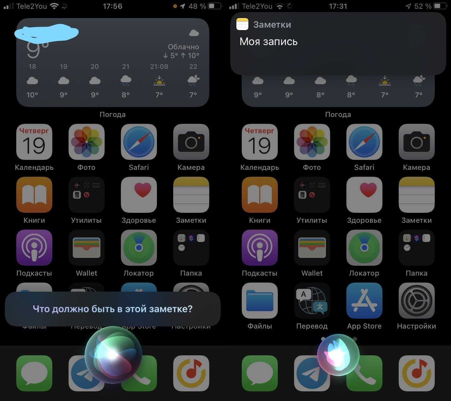 Если вам нужно быстро сделать запись, вы можете попросить об этом Siri. Для этого вам нужно будет активировать голосовой помощник в настройках и желательно включить функцию «Слушать Hey, Siri». Если не ходите запускать Siri таким способом, то активируйте ползунок возле «Вызов Siri кнопкой Домой» или нажатием боковой кнопки. После этого запустите Siri и скажите «Создай заметку», а на вопрос «Что должно быть в этой заметке?» скажите название. Документ появится вверху экрана.