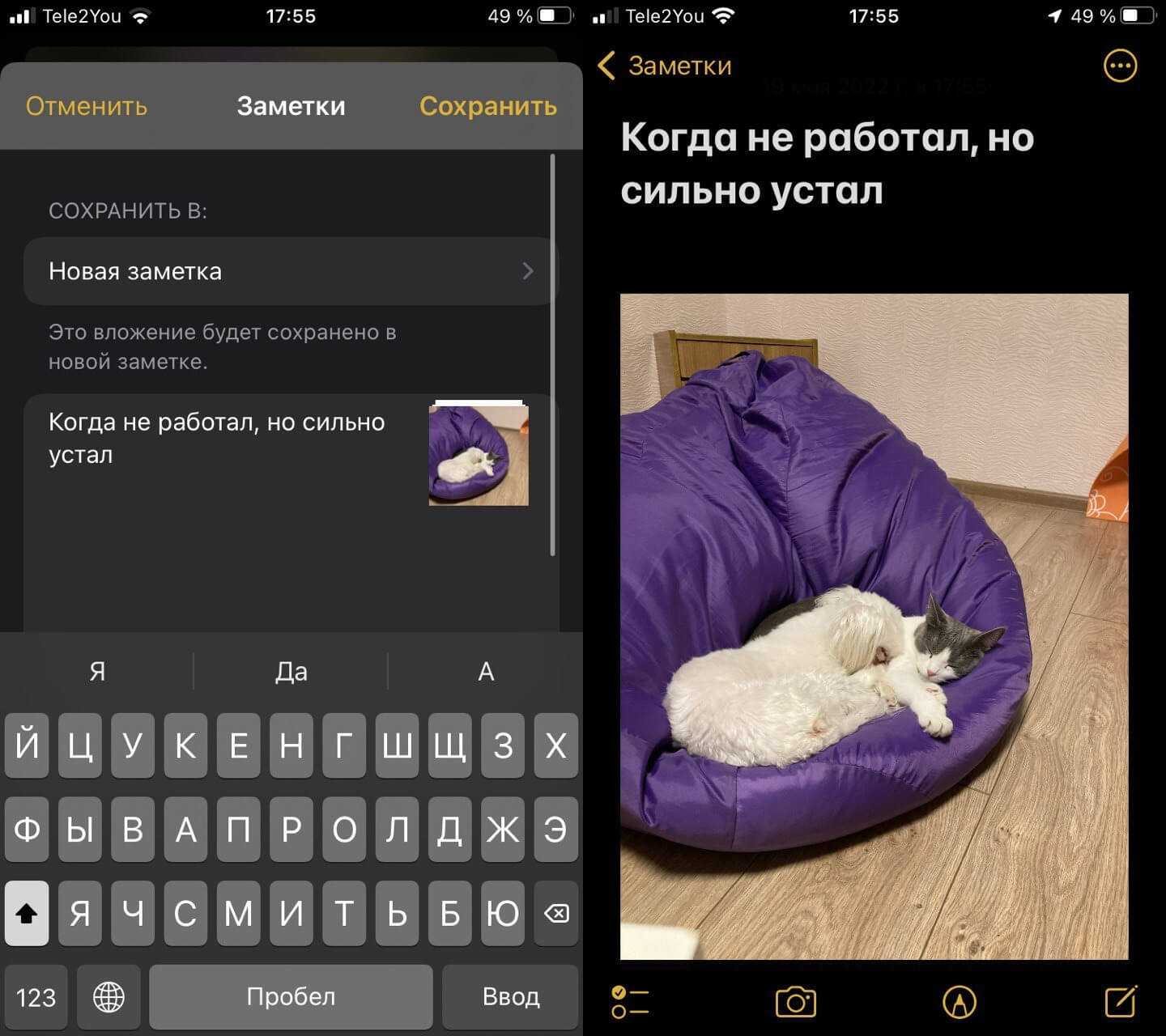 Еще один универсальный метод позволяет создавать заметки на основе файлов или ссылок. Например, вы просматриваете страницу в Safari или фото в Галерее. Нажмите кнопку «Поделиться», после чего в списке приложений найдите «Заметки» и выберите его. Вы сможете добавить к ссылке или фотографии название и письменную заметку перед сохранением, а после полноценно открыть ее в приложении. При нажатии на ссылку в заметке вас сразу перекинет в Safari и откроется нужная страница.