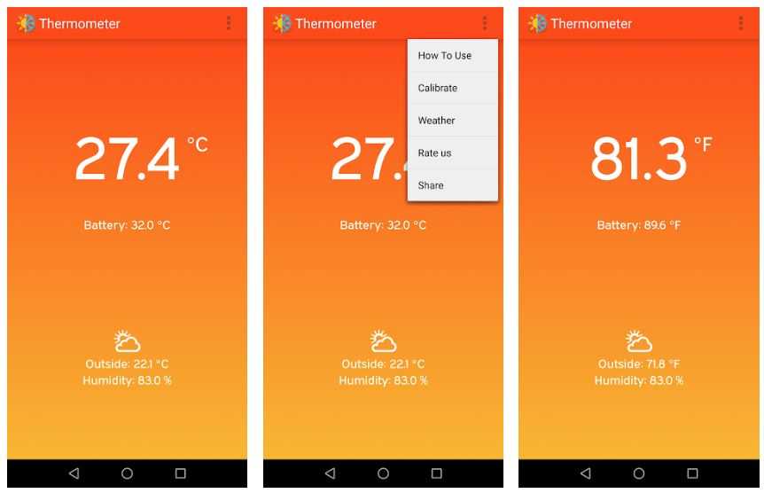 Как следует из названия приложения, цифровой термометр для комнатной температуры предназначен для измерения температуры в помещении. Приложение можно использовать и на улице.