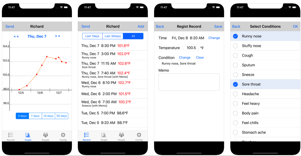 В Body Temperature App вы самостоятельно записываете результаты измерений. В приложении можно хранить записи для нескольких людей.