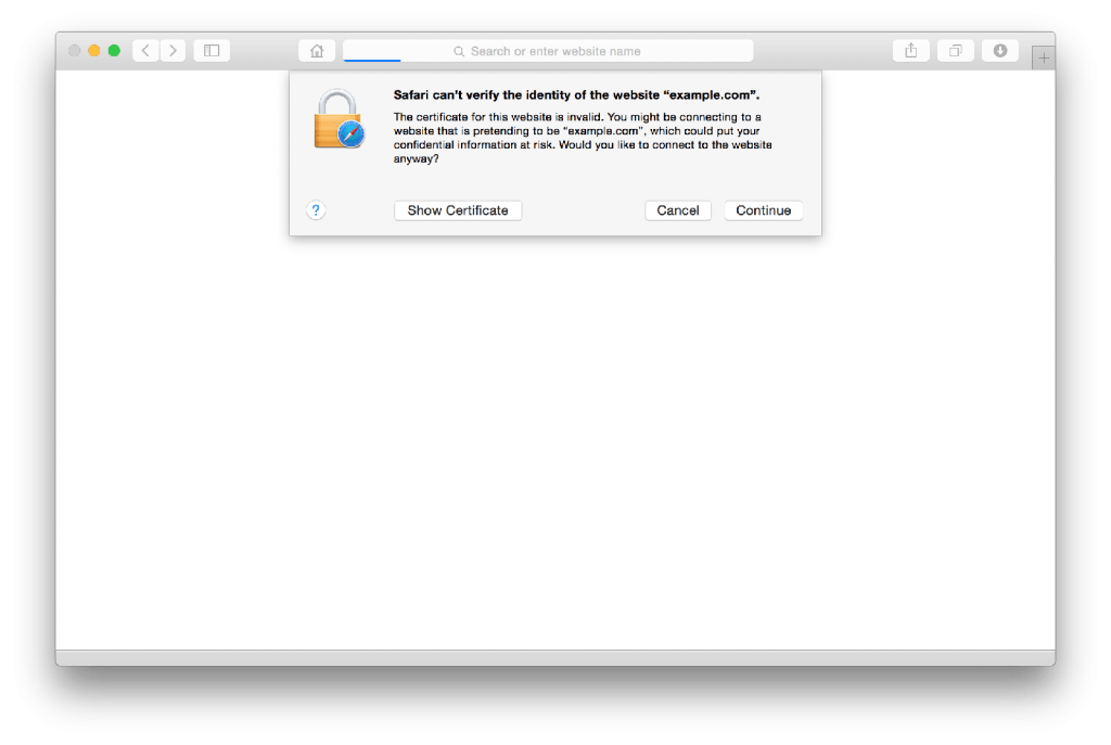 Основным инструментом для взаимодействия пользователя с интернетом является браузер. Именно через его уязвимости злоумышленникам удается установить вредоносное ПО на устройство жертвы или получить необходимые данные. Браузер Safari по праву считается одним из самых безопасных на рынке. Apple реализовала в нем технологию «песочницы», когда каждый сайт открывается в отдельном процессе, изолированным от всей остальной системы. Если на сайте содержится вредоносный код, то у него не будет возможности получить доступ к основной системе. Еще одним инструментом для защиты пользователя является интеллектуальная система, которая способна определять мошеннические сайты и сайты с вредоносным кодом. Если вы пытаетесь попасть на такой сайт, система не будет его загружать и покажет сообщение «Safari не удается проверить подлинность сайта». Выглядит это следующим образом.