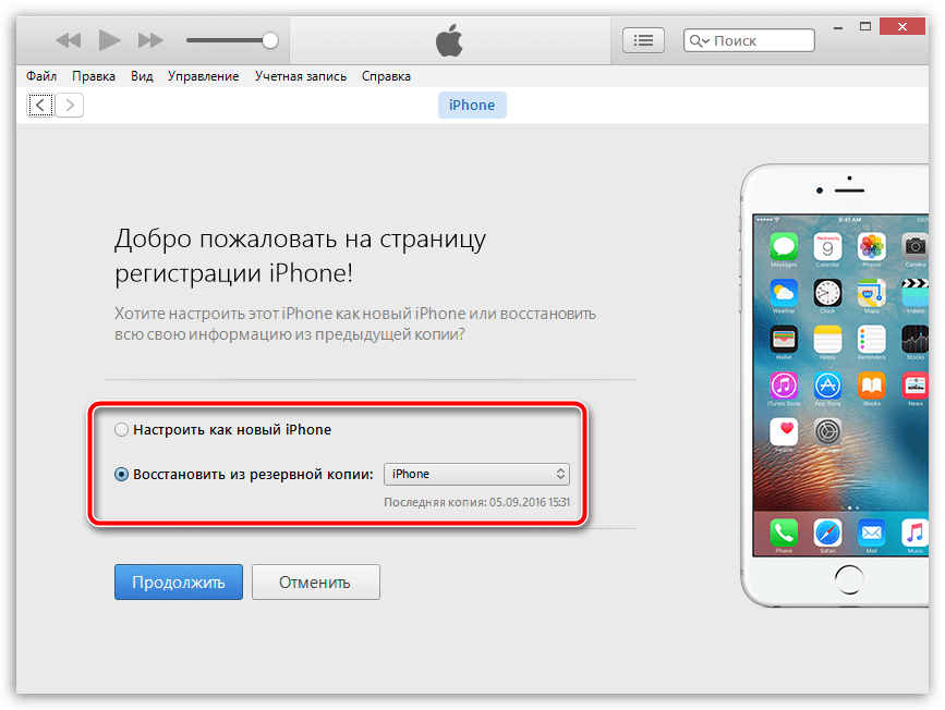 iTunes спросит, что необходимо сделать с iPhone`ом: настроить как новый или восстановить из резервной копии. Если у вас на компьютере или в iCloud уже имеется подходящая резервная копия, выберите ее и щелкните по кнопке «Продолжить»