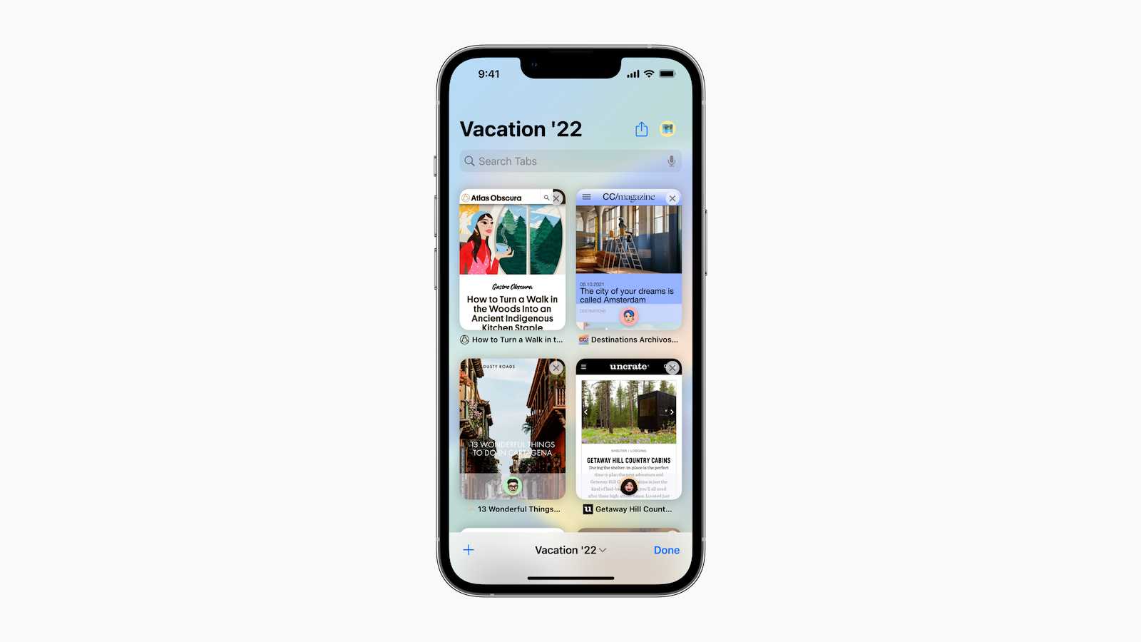 iOS 16 offers start pages for Safari Tab Groups with customizable background images, favorites, and pinned tabs. Safari also gains Shared Tab Groups to share a collection of websites with friends and family, making it easy to add tabs and see what others are viewing.
